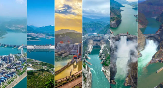 世界最大清洁能源走廊六座梯级电站(从左至右依次为:葛洲坝电站、三峡电站、向家坝电站、溪洛渡电站、白鹤滩电站、乌东德电站)资料图片