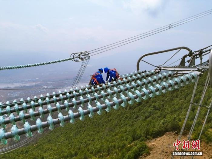 检修人员为特高压工程输电线路更换自爆绝缘子。罗伍达摄